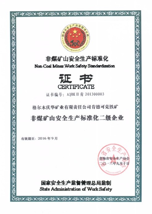 中國慶華青海消息(徐芳)近日,格爾木礦業公司肯德可克鐵礦獲得了青海省安全生產協會頒發的非煤礦山安全生產標準化證書和“非煤礦山安全生產標準化二級企業”稱號。